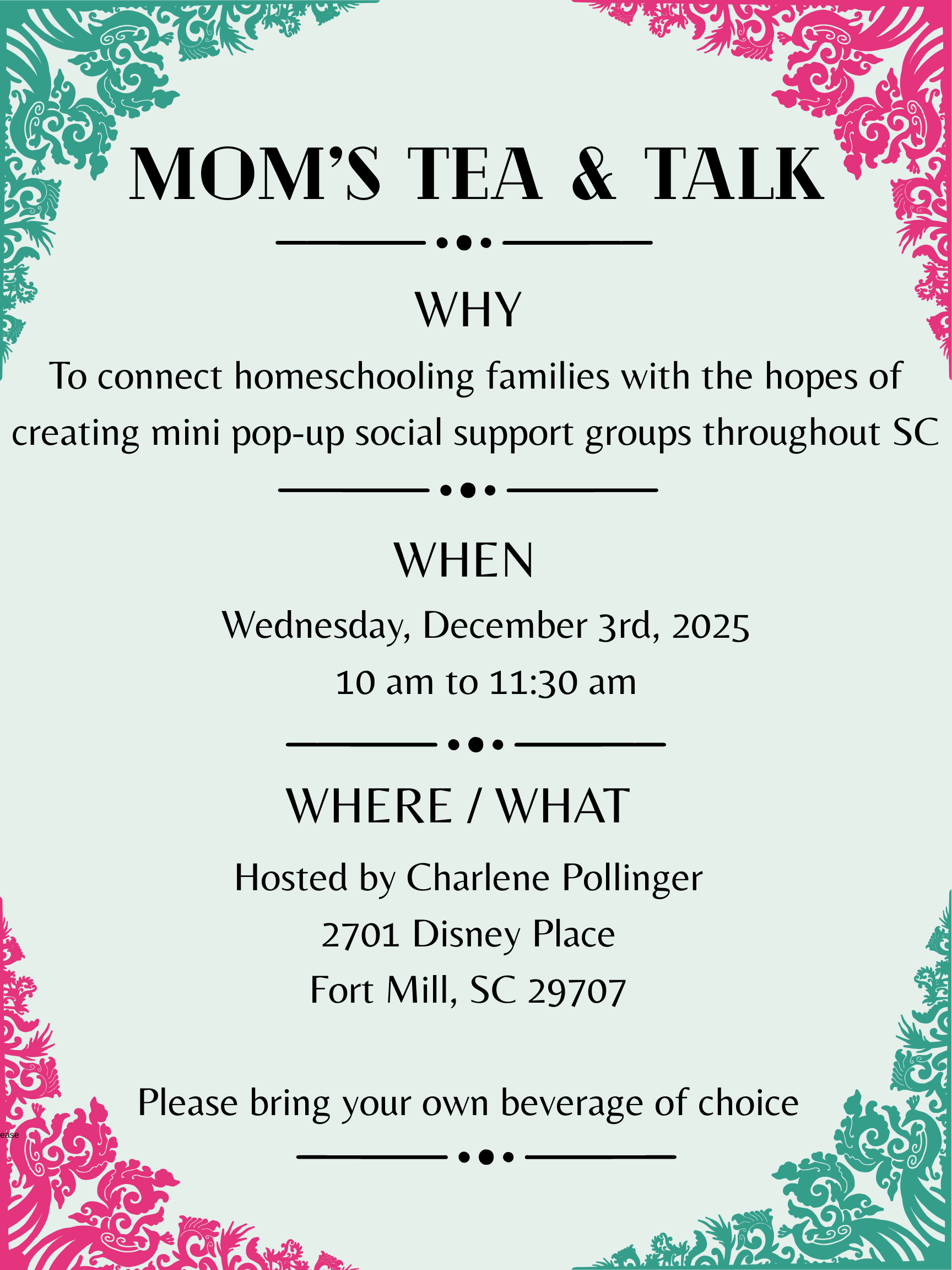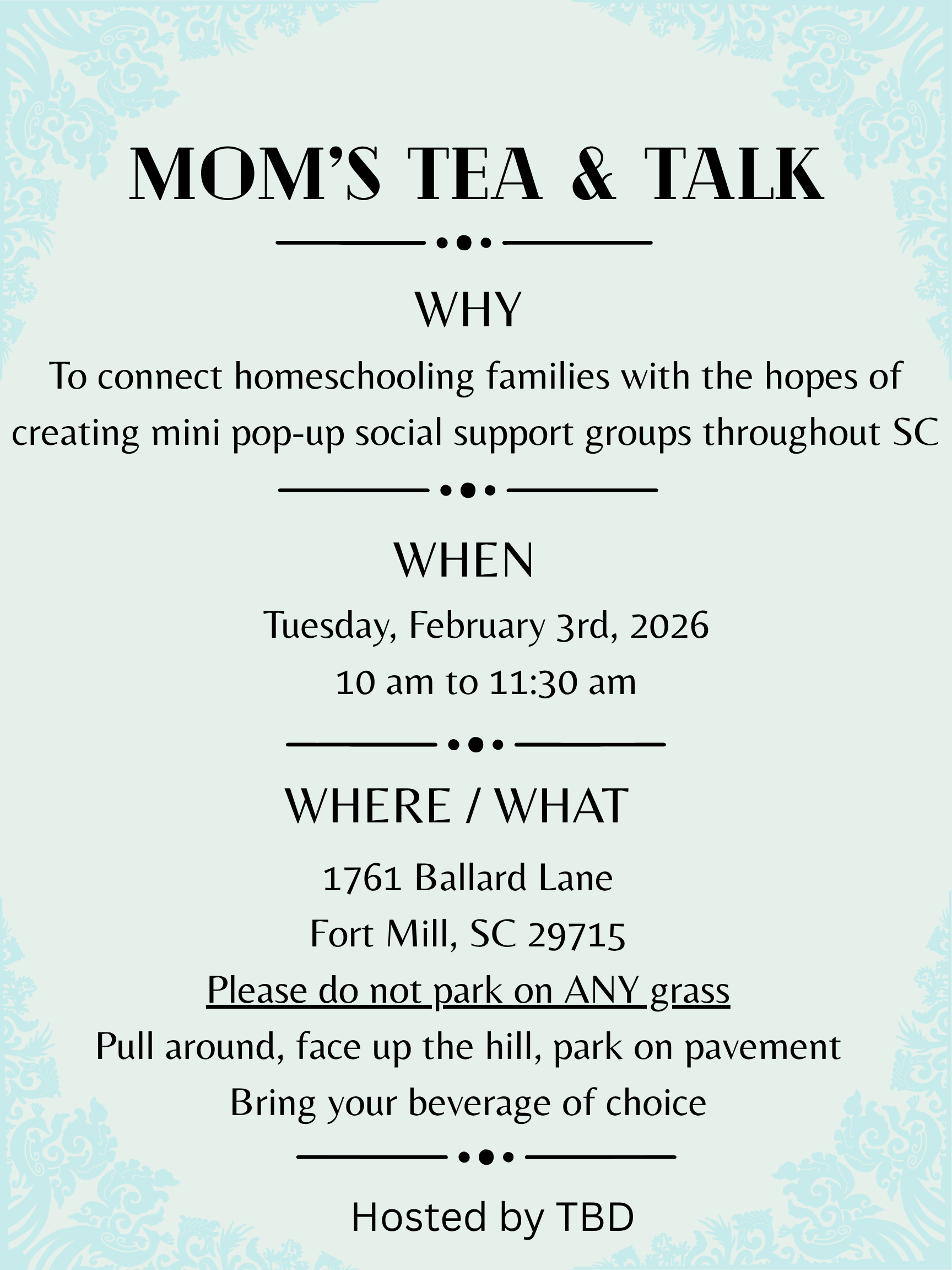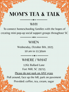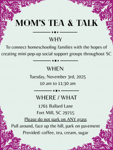 If you would like to host a Tea and Talk or a regular Park Day in your area, please let us know, and we will post it here for others to find. In-person friendships are what takes a nice homeschoo journey into an amazing homeschool adventure!
